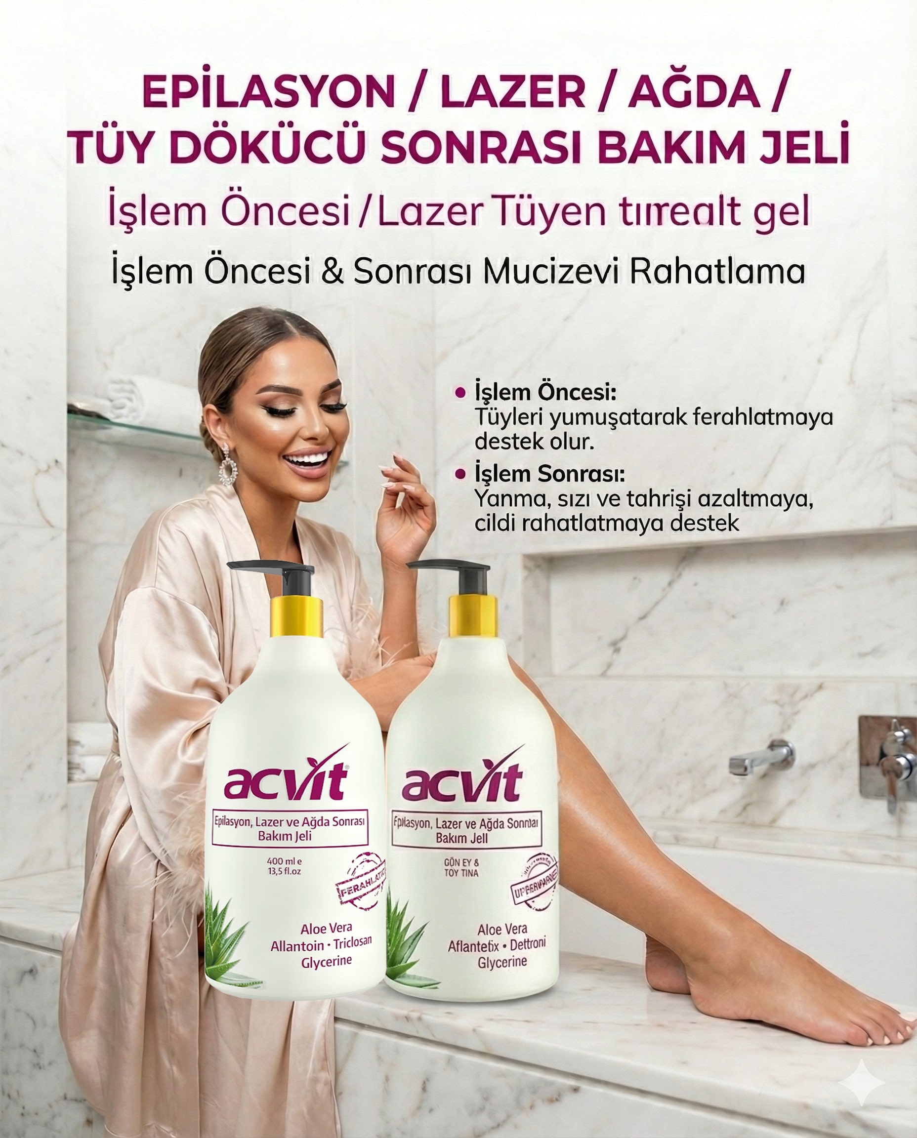 Epilasyon – Lazer – Ağda seanslarından 2 gün önce sabah-akşam kullanılması işlemin daha verimli ve konforlu olması açısından faydalıdır.