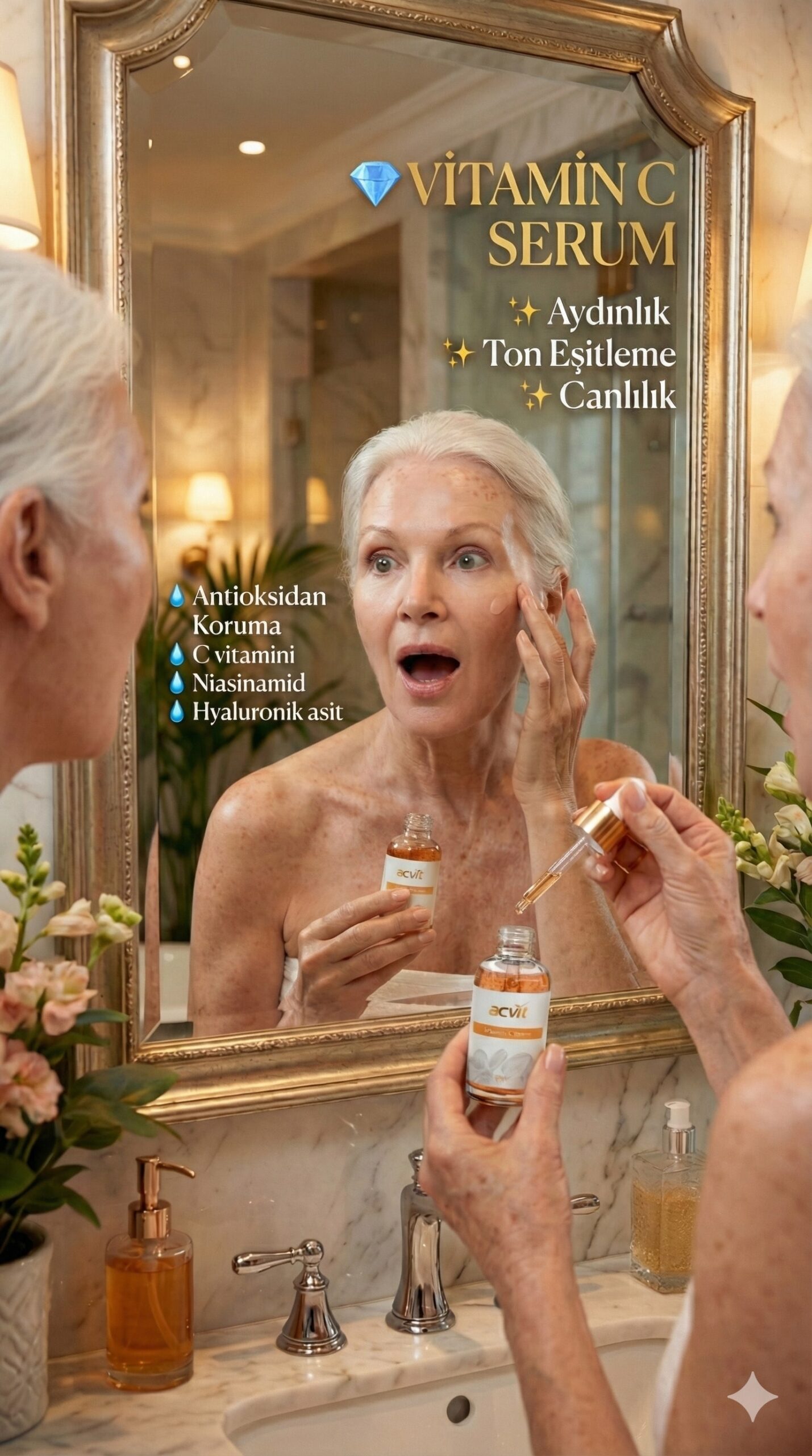 Aydınlık & Ton Eşitleme: C vitamini ve niasinamid ile ton dengesine katkı sağlayabilir.